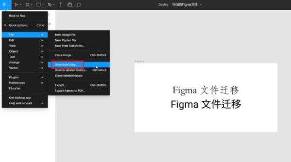 在 Figma 中打开待导出的文件,点击左上角的 Figma 图标,选择 File >> Save local copy ,将云端的 Figma 文件下载到本地,可以得到一个 fig 格式的文件。
