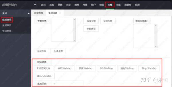 按照下边截屏所显示的操作流程:生成→生成选项→网站地图需要生成什么地图直接点一下相对应的选项卡就可以自动生成。RSS订阅文件,谷歌SiteMap,百度SiteMap,SO-siteMap,神马-SiteMap,搜狗SiteMap,Bing-SiteMap