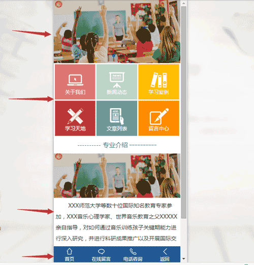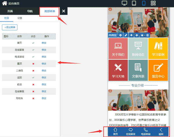 第三步:首页编辑。编首页内容包括包括:banner图片、网站栏目。云指建站的样板已经有自带的栏目了,大家根据自己的需求来修改一下就可以了。一般情况下,手机企业站的栏目包括:关于我们、产品展示、新闻动态、在线留言、联系我们等。