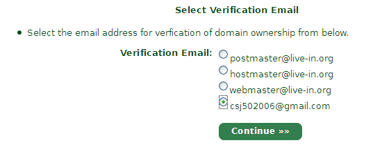 选择一个验证的邮箱,有postmaster@域名、hostmaster@域名、webmaster@域名、和注册域名时的邮箱。