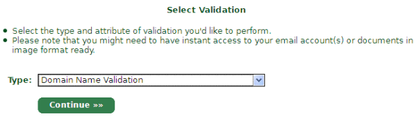 选择Domain name validation,点击Continue。