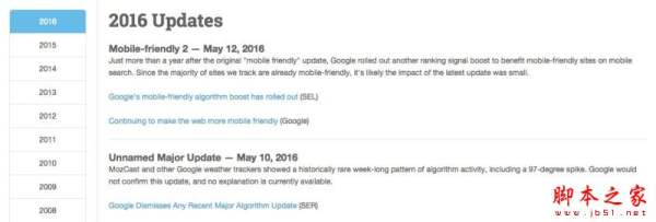 利用Moz的一个工具(Moz’s Algorithm Change History),在这里可以查看网站从2000年到现在的主要的一些变化,并且经常更新,对我来说这个功能非常的重要。这个页面列出的网站更新情况还可以让我发现一些工作中我的一些改动所带来的其他影响。因此我会经常到这里查看是否有一些新的动态信息。