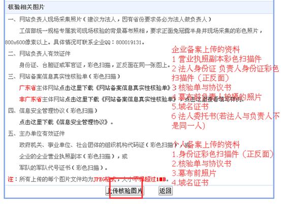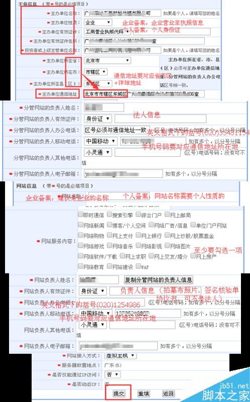 3、进行备案信息的填写并提交,下图中红色字体为填写注意要点: