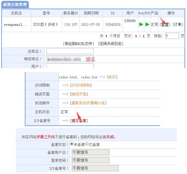 2、点击管理,在管理界面点击提交备案,可以看到网站的备案状态: