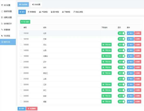 3、新增城市分站功能,可指定栏目、指定页面生成分站页面、支持详情页分站页面、分站列表前台显示、自定义内容编辑、城市筛选、可对城市列表详情ID、SEO标题、描述、关键词的自定义设置。真正快速解决传统网站收录低、收录慢的问题,让你的网站排名成为行业焦点。