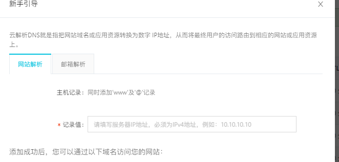 阿里云提供了非常方便的域名解析步骤,分为新手引导和添加解析。如果不擅长操作和分析,可以使用新手指导来完成网站域名解析的工作,如下图:
