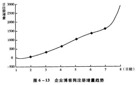 以企业博客开通后前两个月收集的注册用户日增长数据作为数据。选择7个点,用Matlab绘制企业博客注册用户增长趋势曲线(见图6-13),可以更直观地看到企业博客注册用户数的增长情况。